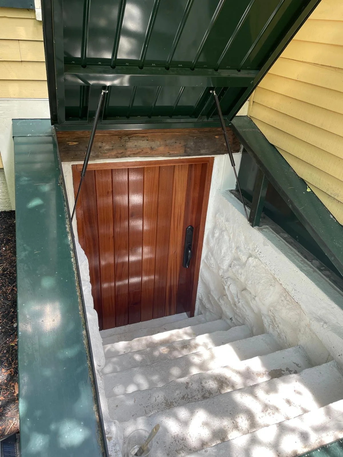 Mahogany storm door made air tight with insulation and traditional joinery.
