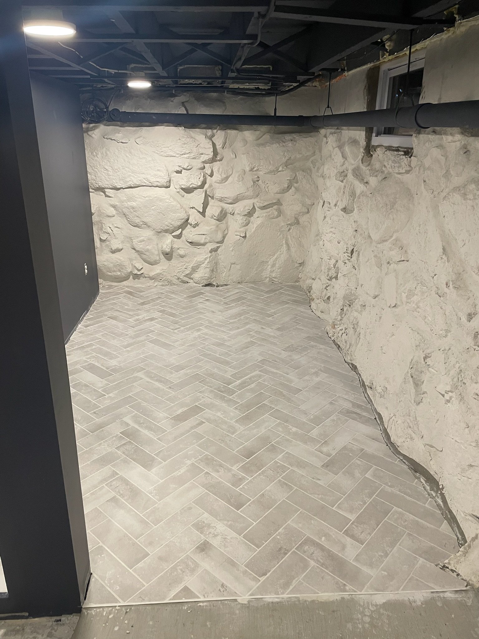 A basement pantry- Previously an empty space, now reimagined and renovated with herringbone tiles, and custom cabinetry and invisible wine storage system.